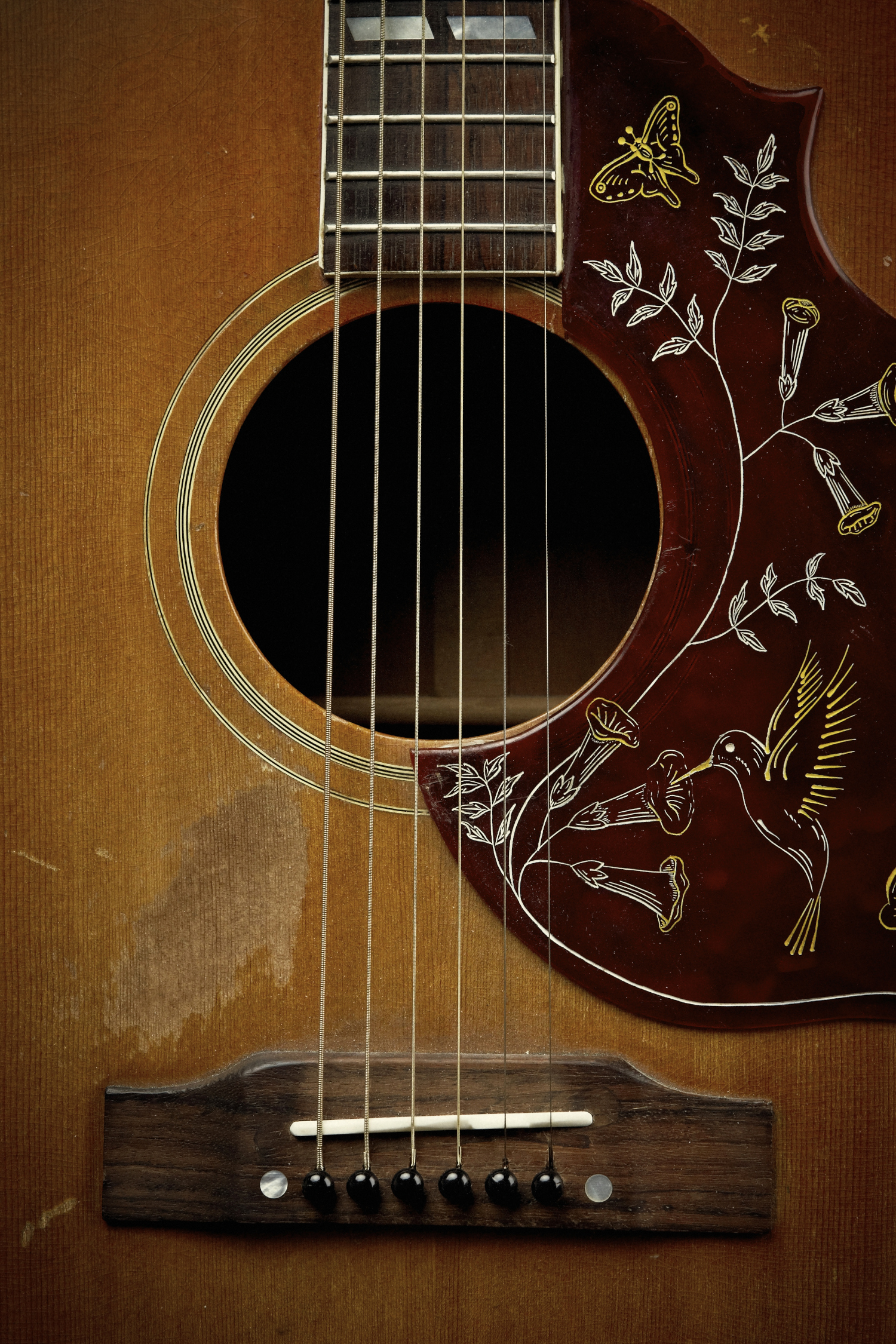 Eneste fejl, var en justérbar saddel (indlægget, dér hvor strengene forsvinder ned i guitaren), som "åd" en hel del lyd - men disse er som regel, senere afmonterede. Ellers manglede Hummingbird'en - altså i 1961- bare lige 40 - 50 års landevejs-brug - eller slitage, for at springe ud i fuldt flor, men dét var jo ikke let at vide. - Så allerede fra midt i 1960'erne begyndte Gibson at ændre modellen, så den - osse forårsaget af andre problemer hos Gibson - blev en gradvist mere tvivlsom...