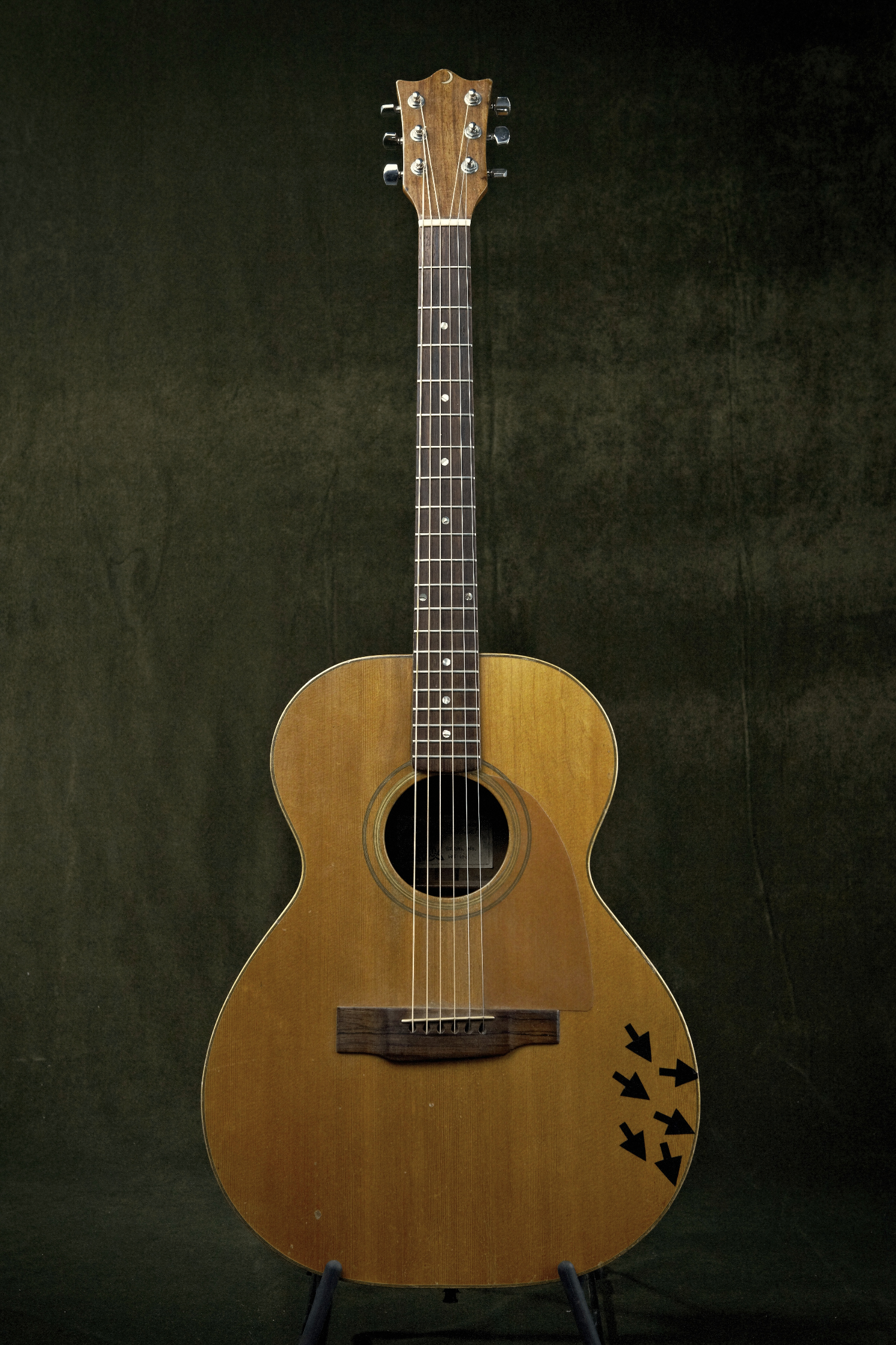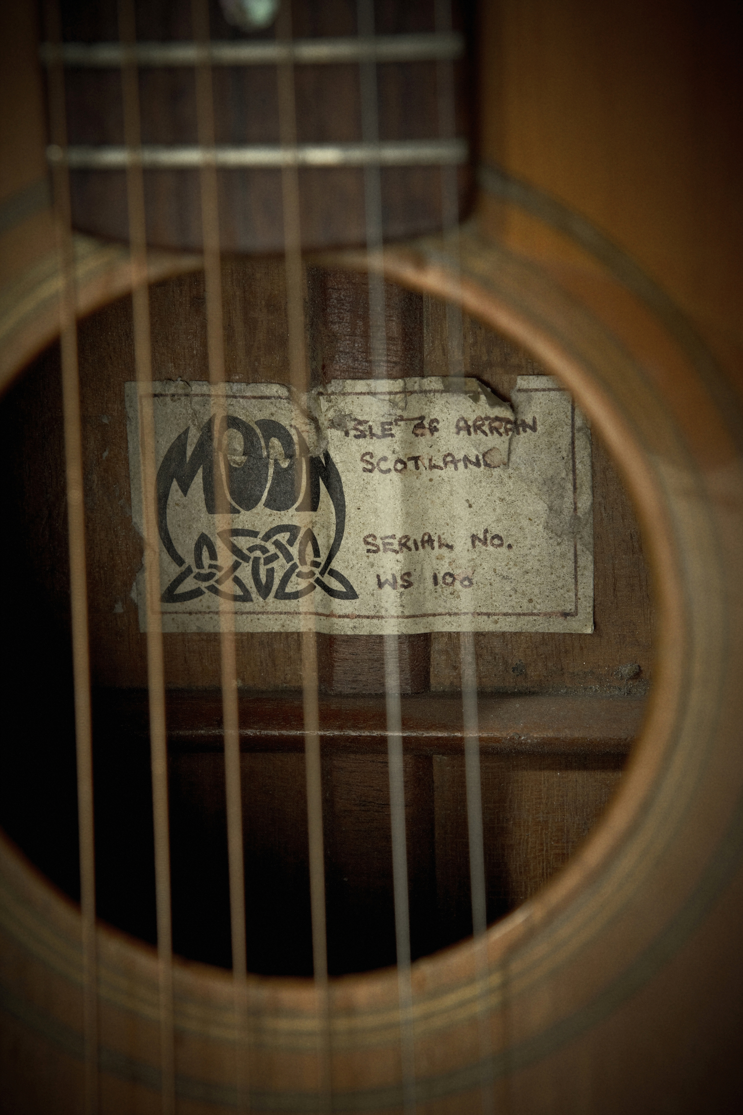 Mange år senere - efter jeg med en passer og blæk (fy!) havde tatoveret den med de sorte pile (helt nøjagtig, mens jeg sad og så de første reportager, fra den første Golf-krig, på fjerneren) mødte jeg dens skaber, Jimmy Moon, på Tønder-festivalen. - En vittig, festlig lille skotte. Jeg viste ham min Moon, og han blev meget rørt. Det var nemlig den første guitar, han overhovedet byggede. Deraf serienummert, 100. Hans kone var med, og huskede, hvordan hun sad og håndskrev sedlen, med nummeret, før det blev klæbet ind i guitaren.